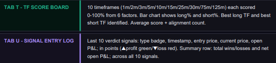 Every bar, all 19 factors are recalculated. A factor scores either +1 LONG or +1 SHORT, never both. Higher scores confirm stronger directional conviction.
