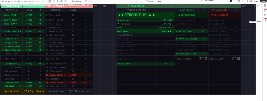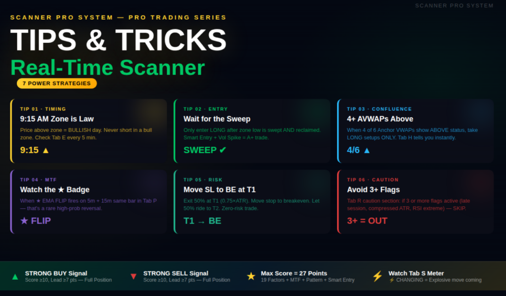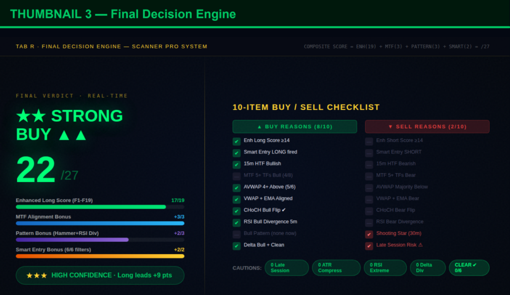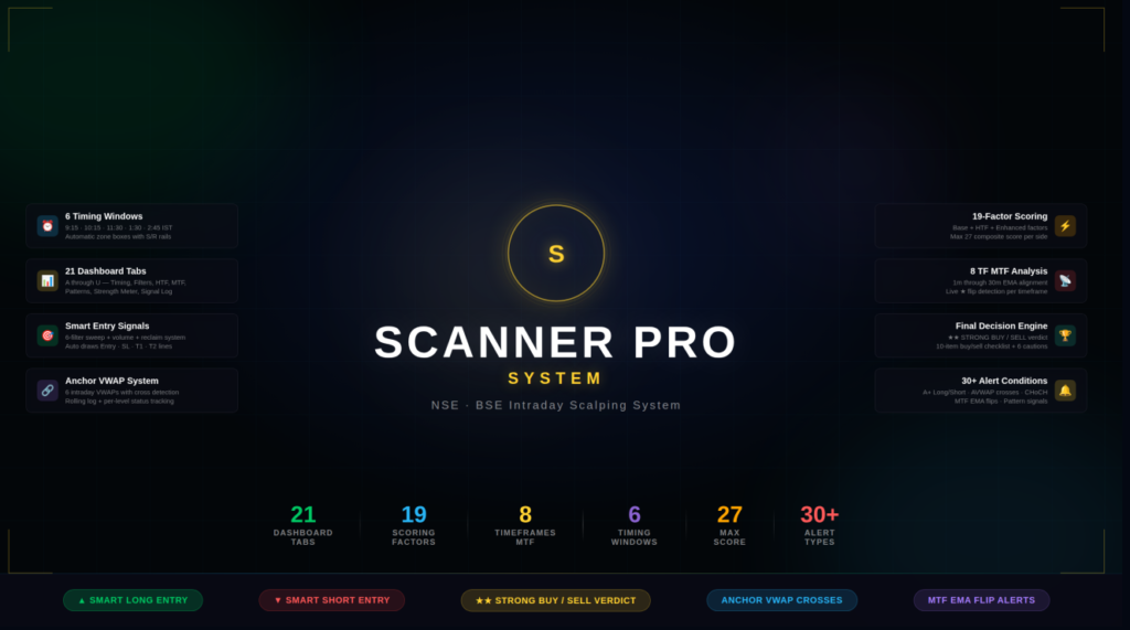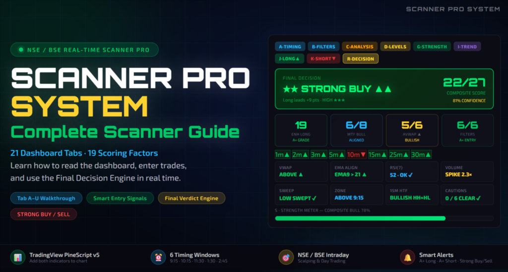 SCANNER PRO SYSTEM, is a comprehensive trading view real time scanner for stock and index that brings together 21 dashboard tabs and 19 scoring factors to help traders make faster, more accurate decisions; this complete scanner guide teaches you how to read the dashboard, enter trades, and use the Final Decision Engine in real time, while walking you through Tab A–U, highlighting Smart Entry Signals, explaining the Final Verdict Engine