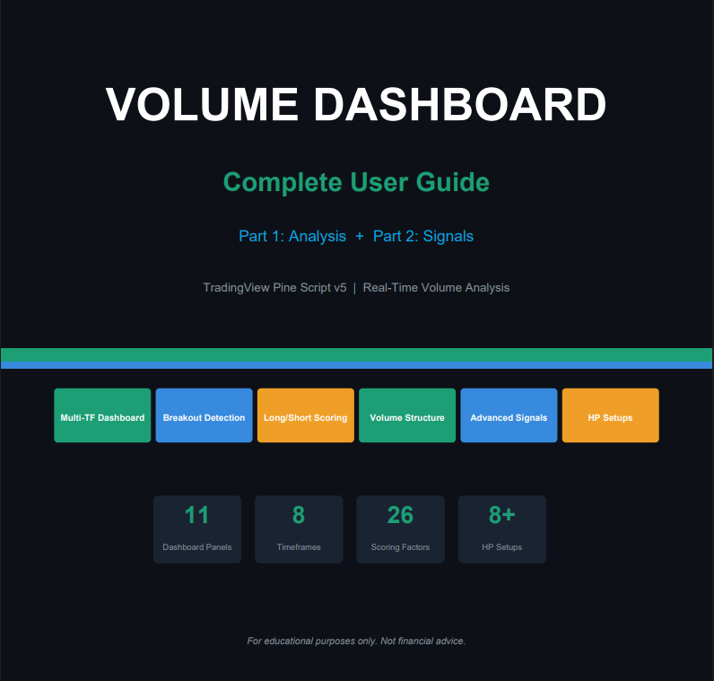 The Volume Dashboard is a two-part TradingView Pine Script indicator suite built for real-time volume analysis and high-probability trading decisions. Displayed directly on your chart, the dashboard offers 11 fully interactive panels that simplify volume-based insights and entry decisions.